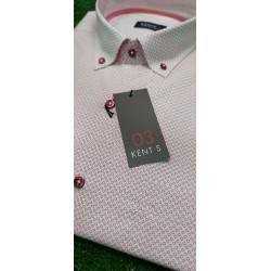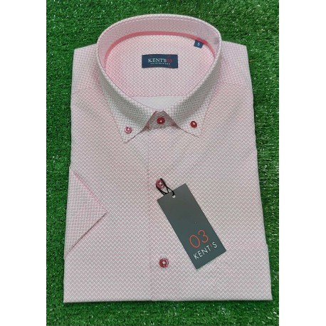 Camisa verano hombre de manga corta, cuello con botones de color a contraste y bolsillo. Fabricada en un tejido de poliéster y algodón, fresco y de fácil planchado, con un estampado pequeño parecido a corazones.