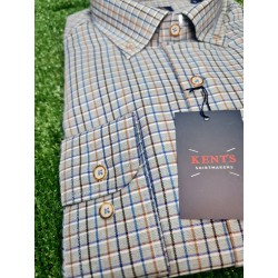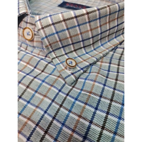 Realizado en un tejido de villela con fondo verdoso y cuadros pequeños en tonos marrones, azules y blancos.