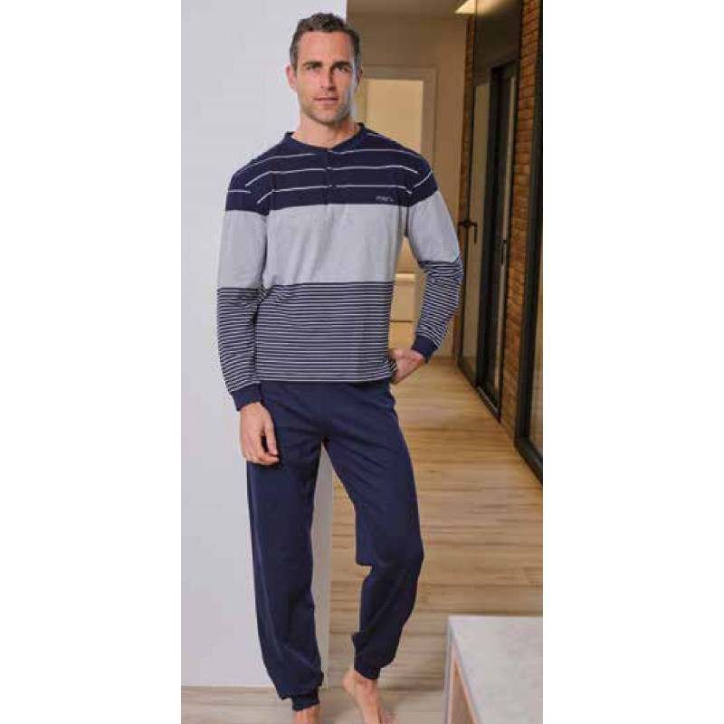 Pijama hombre de tejido fino de invierno. Camiseta de manga larga con puños, cuello caja con abertura de botones, tejido bicolor con rayas de diferentes tamaños, el pantalón es liso con goma en la cintura y puños.